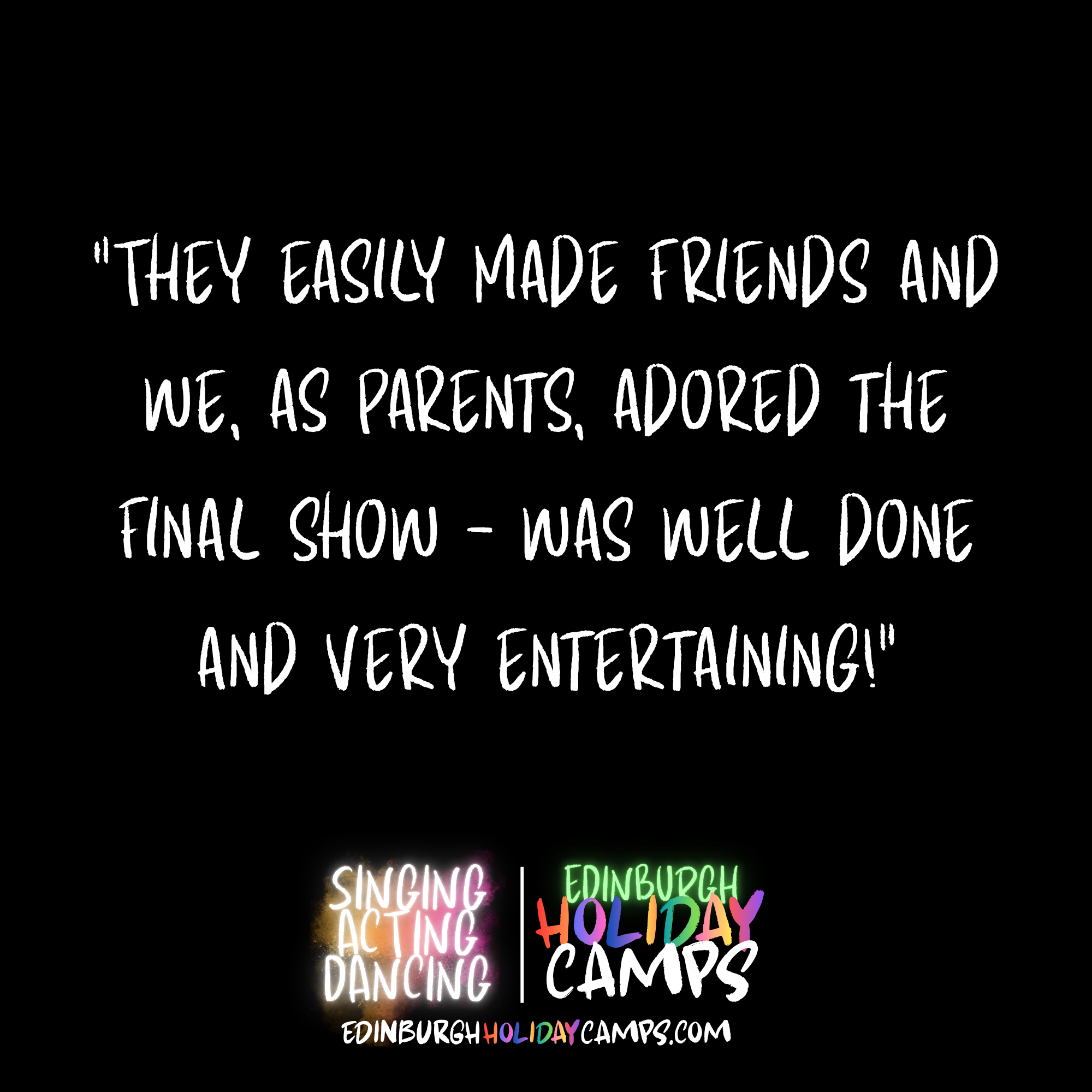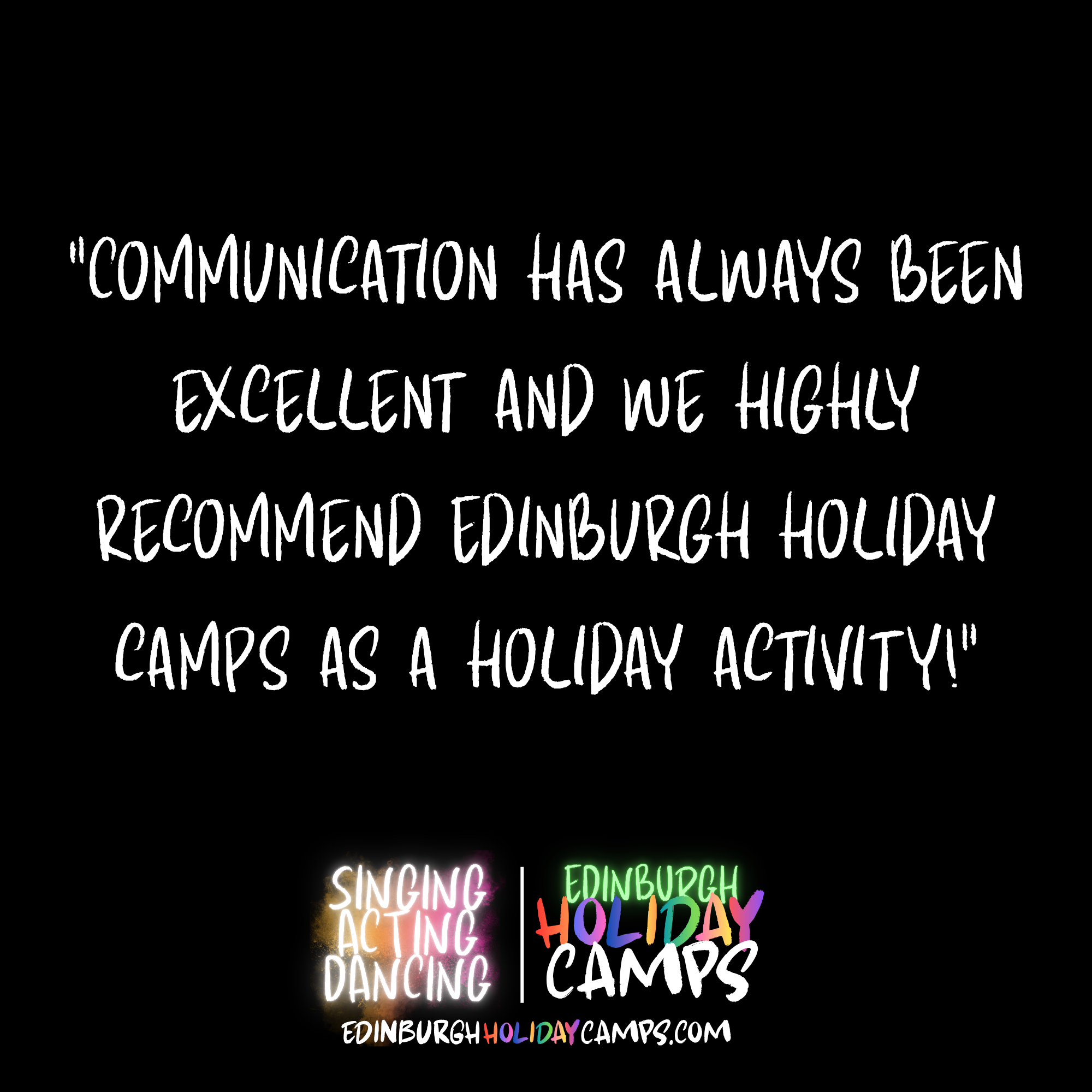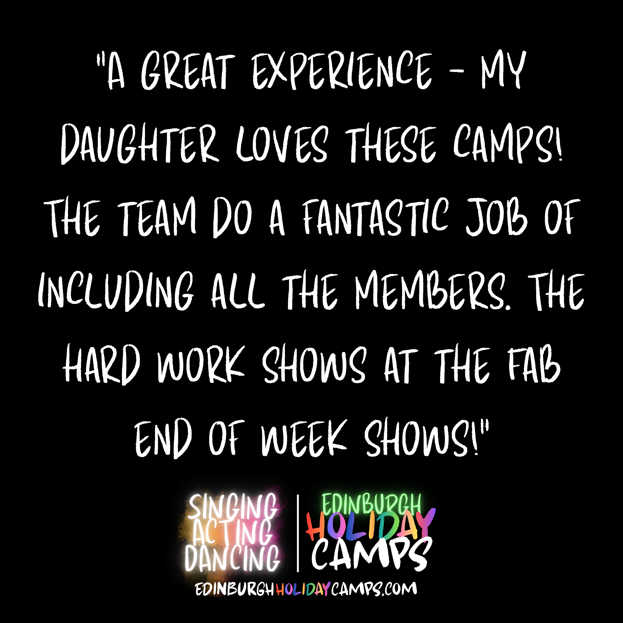 Edinburgh Holiday Camps started from a love of theatre and performance, and then adding a particular focus on providing a really high quality school holiday activity! We don't compromise on the quality of our performance classes because it's a holiday club and we never compromise on our exceptional care because we are a theatre school.