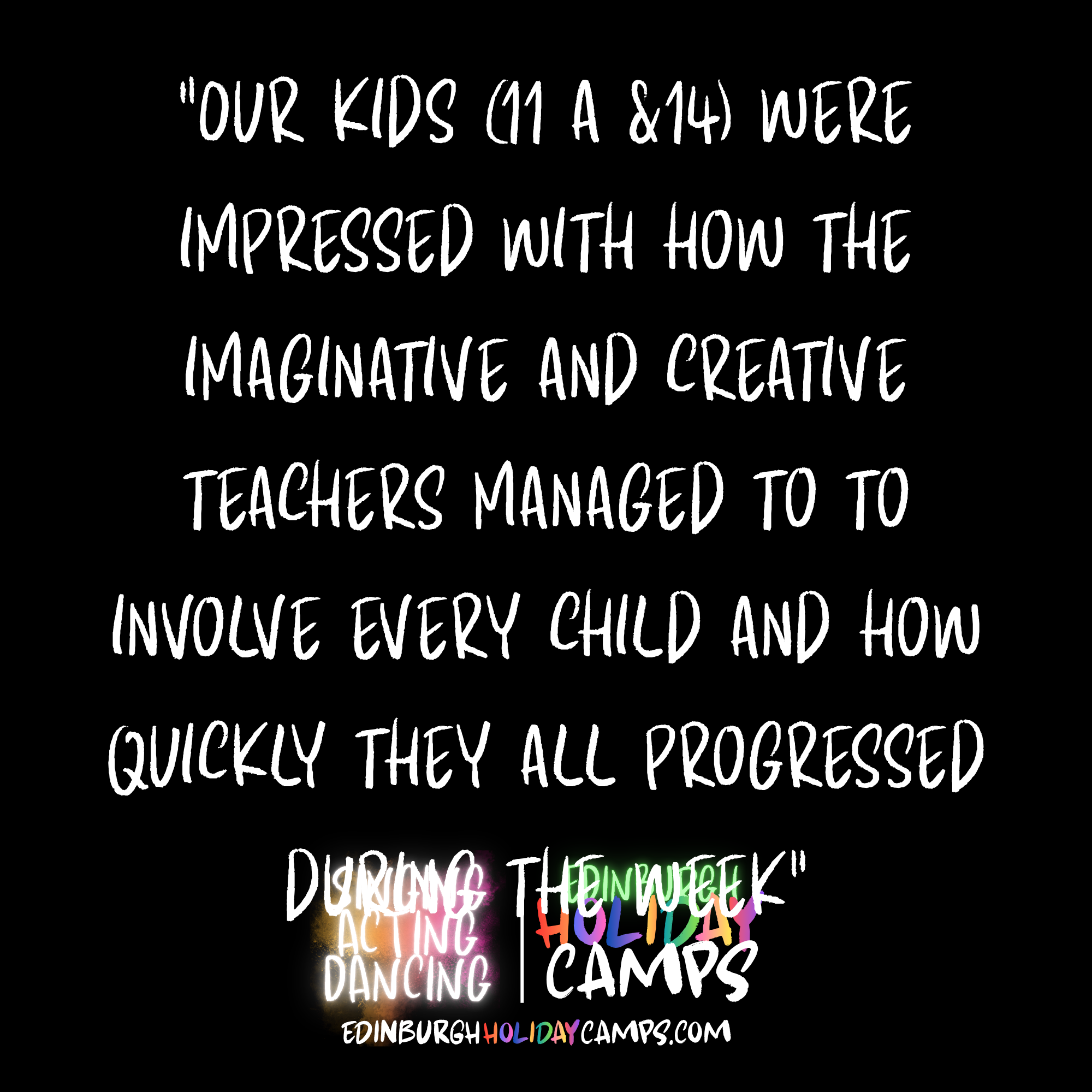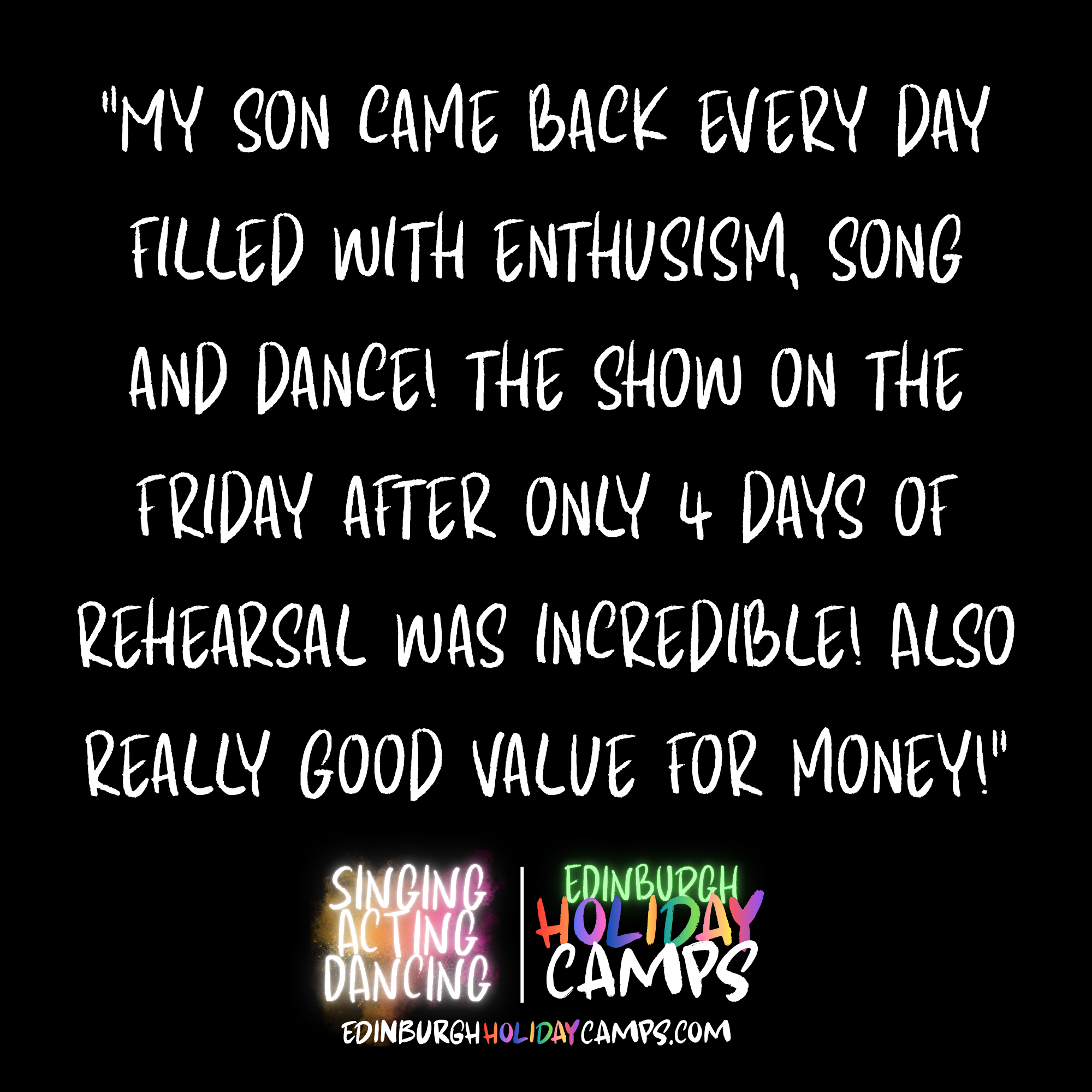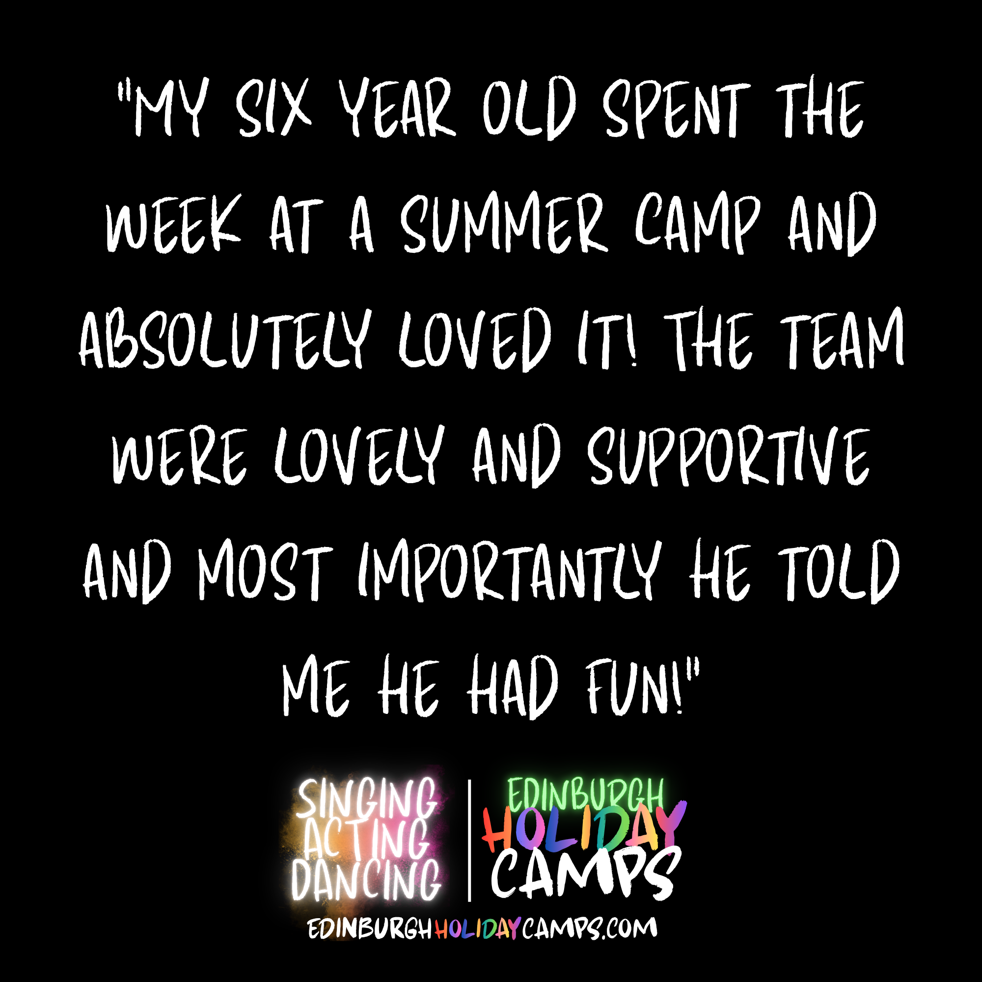 Edinburgh Holiday Camps started from a love of theatre and performance, and then adding a particular focus on providing a really high quality school holiday activity! We don't compromise on the quality of our performance classes because it's a holiday club and we never compromise on our exceptional care because we are a theatre school.